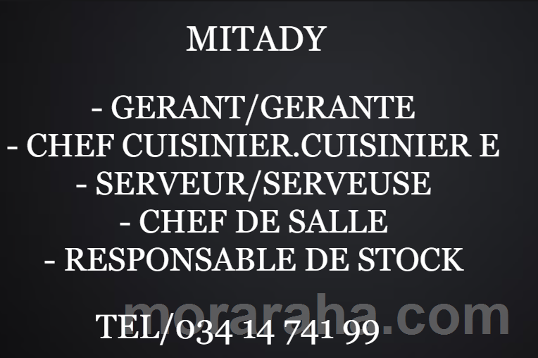 Aza misalasala mandefa CV-nao amin'ny whatsapp, ary soratanao ao ny asa tadiavinao (ohatra: Gerant, Chef de Salle, Responsable de stock, Caissière, Serveur/commercial, Chef cuisinier, Cuisinier, aide cuisinier, sécurité,....).