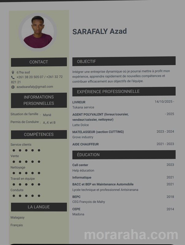 Je suis SARAFALY Azad, jeune motivé et sérieux, actuellement à la recherche d’un emploi (service client, vente, livraison ou comptoir).