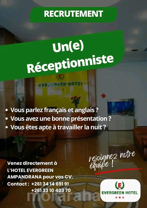 bligatoires 🔹 Bonne présentation 🔹 Disponible pour le travail de nuit Si vous êtes sérieux(se), motivé(e) et que l’accueil est votre point fort, ce poste est pour vous ! 📍 Lieu : Hôtel EVERGREEN – Ampandrana (en face de la pharmacie Ampandrana) 📞 Contact : +261 34 14 691 91, +261 33 10 403 70