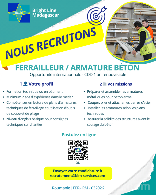 Dans le cadre d’un recrutement international, nous recherchons des Ferrailleurs qualifiés souhaitant développer leur carrière et saisir une opportunité professionnelle en Roumanie.