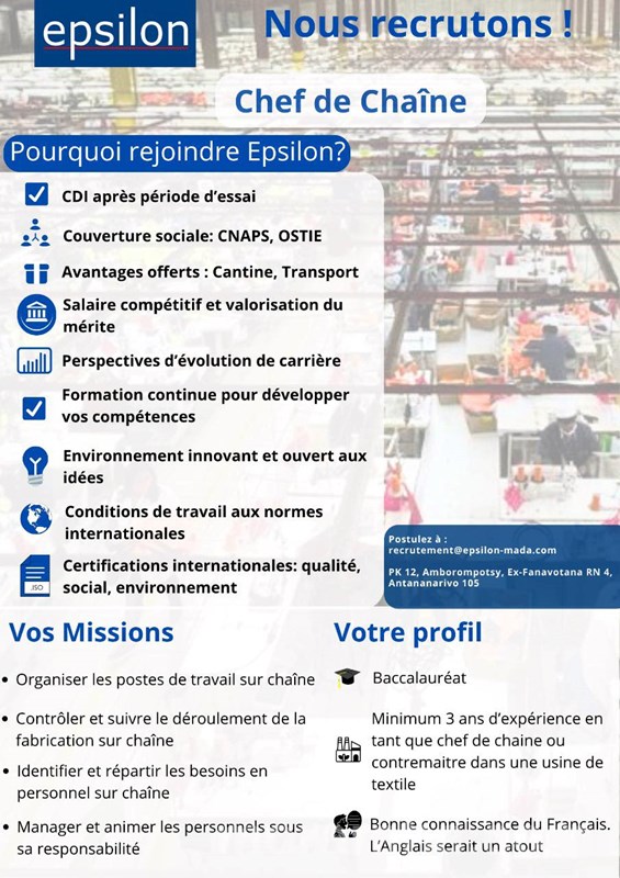 Nous recrutons !Epsilon recherche un(e) Adjoint(e) Chef de Service Cantine.Vous êtes motivé(e), organisé(e) et avez une expérience en restauration ? Postulez dès maintenant ! Envoyez votre CV à : recrutement@epsilon-mada.com