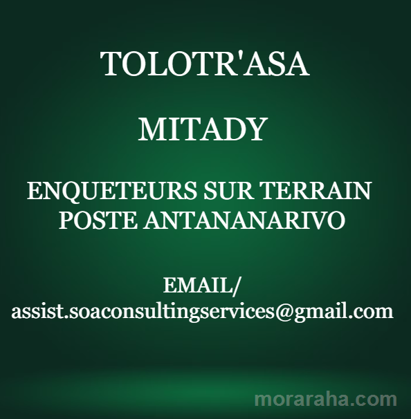 Enquêteurs terrain – Antananarivo Date limite de candidature : 05 Janvier 2026 | Antananarivo Missions : -Réaliser des enquêtes auprès des particuliers, professionnels et entreprises -Conduire des entretiens qualitatifs avec acteurs économiques locaux -Administrer des questionnaires selon les protocoles définis -Garantir la qualité, l’exhaustivité et la fiabilité des données collectées -Remonter les observations terrain et enseignements qualitatifs -Respecter les délais et règles de confidentialité Profil : Bacc + 2 en marketing, commerce, gestion Expérience confirmée en enquête sur terrain Capacité à travailler en équipe Bonne connaissance du français (écrit et oral) Disponible de suite SMARTPHONE à disposition Si ce poste vous convient, envoyez votre candidature (CV + LM avec prétention salariale) à assist.soaconsultingservices@gmail.com Les candidatures sans prétentions salariales ne seront pas retenues
