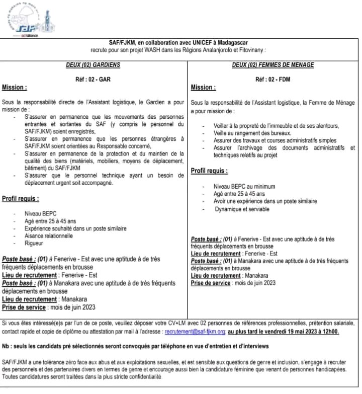 ALEFASO @ TY ADRRESSE EMAIL ITY NY DOSSIER: recrutement@saf-fjkm.org