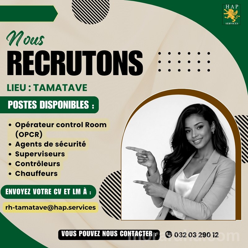 Dossiers à fournir :• Lettre de motivation (LM)• Curriculum Vitae (CV)Dépôt de candidature :• Email : rh-tamatave@hap.services• Téléphone : 032 03 290 12