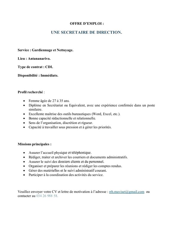 Lieu : Antananarivo.Type de contrat : CDI.Disponibilité : Immédiate.Merci d’envoyer votre CV+ Lettre de motivation à l'adresse : rrh.maviset@gmail.comContact : 034 26 988 58.