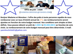 Bonjour Madame et Monsieur. J'offre des prêts à toute personne capable de nous rembourser avec un taux d'intérêt annuel de 2 %. Les remboursements seront ajustées en fonction de votre budget mensuel. Nos conditions sont simples et bien définis. Vous pouvez obtenir un prêt de 2.000 € à 90.000.000 € en fonction de votre choix. Le remboursement de votre budget mensuel peut être déterminée. E-mail: yasmina.briois01@yahoo.com