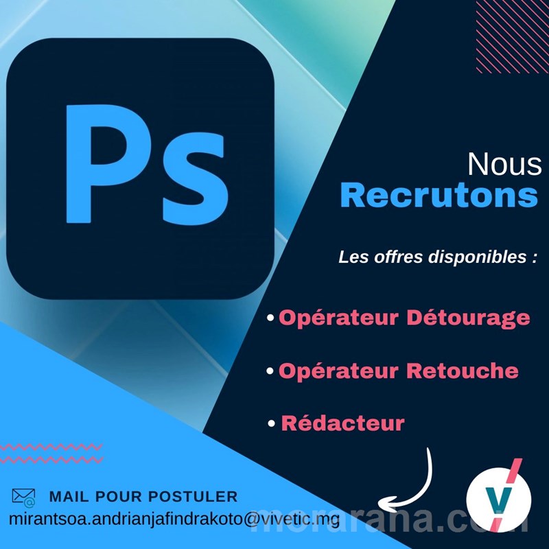 Pour postuler à ces merveilleuses offres d’emploi, il vous suffira de nous écrire un petit email à mirantsoa.andrianjafindrakoto@vivetic.mg en y joignant votre CV. a mirantsoa.andrianjafindrakoto@vivetic.mg
